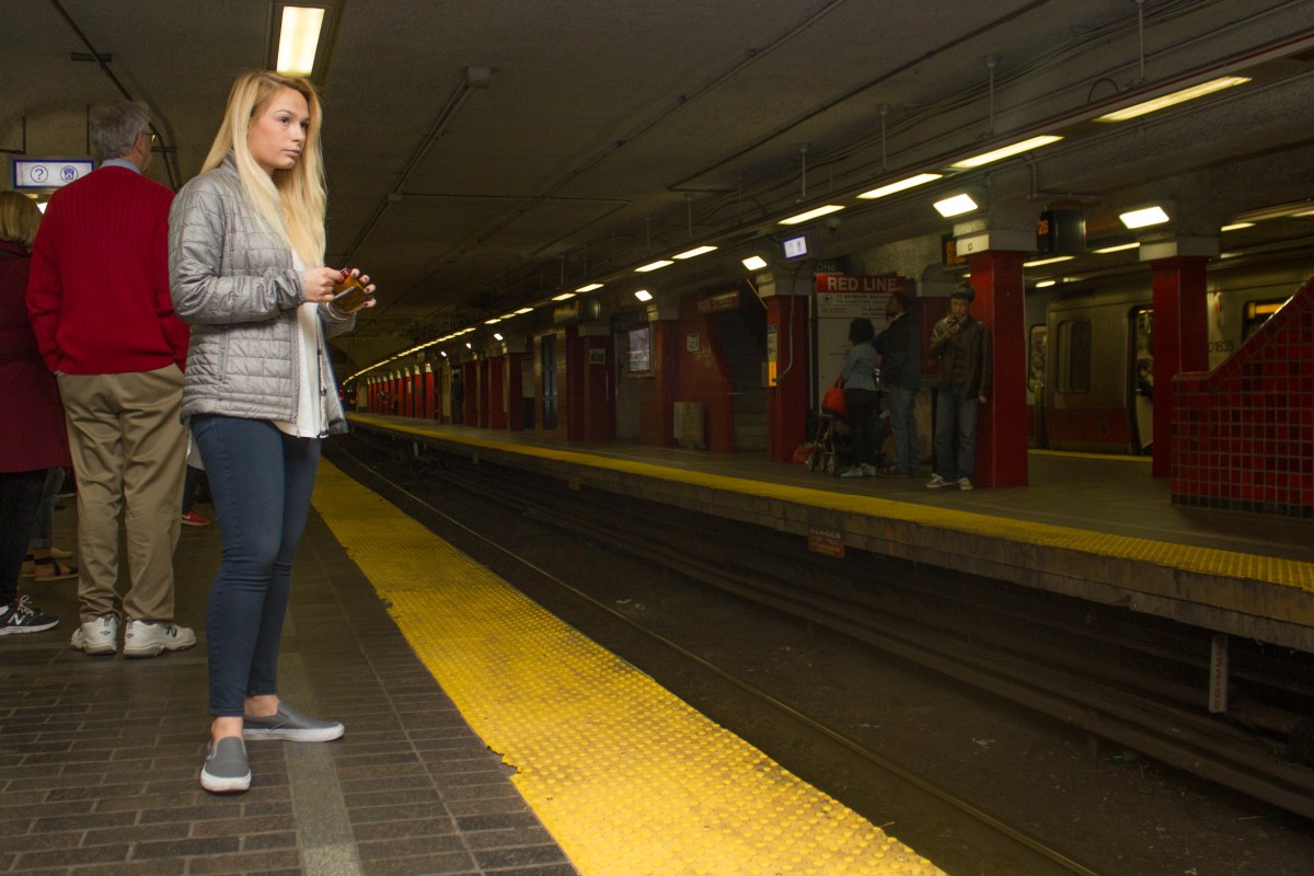 Oct. 10, 2015 – Paige Smith, a sophomore at Boston University, prepares to board the train at Park Station in downtown Boston to go to Punkin’ Fest Saturday. Smith said her main motivation for attending was to carve a pumpkin. Photo by J.D. Capelouto.